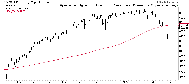 The S&P 500 closed March at 6,528.52 below its 200-day simple moving average of 6,639. The index fell ~5% in March alone, capping a Q1 decline of 4.8%. It's now ~6% off the January all-time high of 6,978.