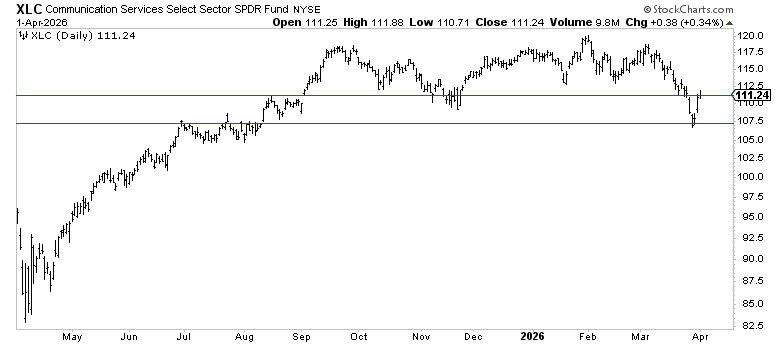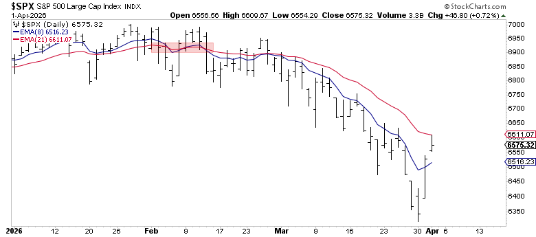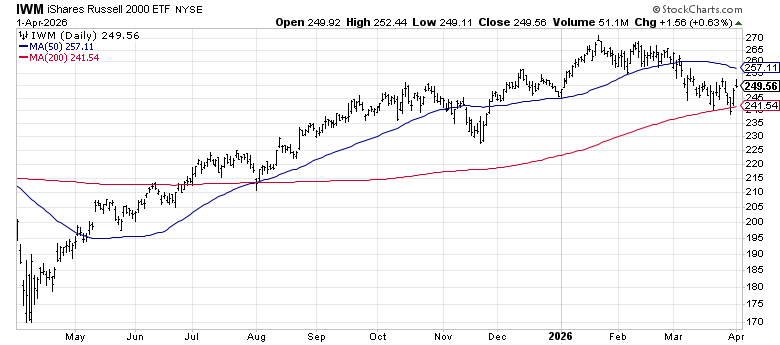 Small caps (IWM) dropped 5.8% in March and are now sitting right on their 21-day EMA at $249.59. The index briefly broke below its 200-day moving average on March 30 before bouncing back above it on April 1, a level that’s been support since November 2024.