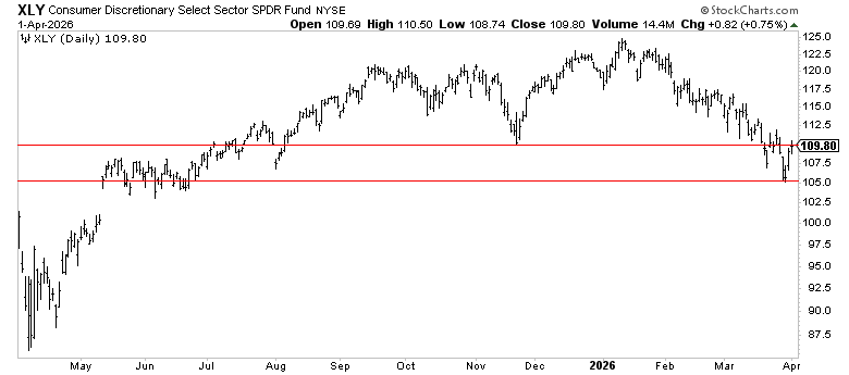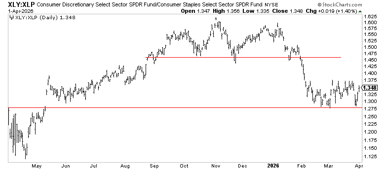 XLY:XLP holding the May 2025 low. A break below 1.24 on this ratio would signal consumer risk appetite is genuinely rolling over. It held in March. It needs to keep holding.