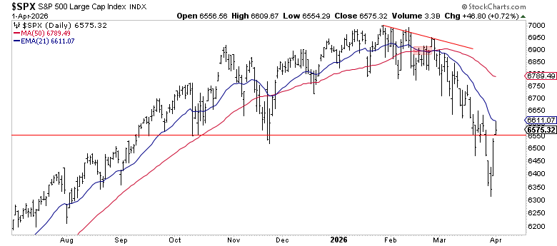 As of April 1, the S&P 500 sits at 6,575, sandwiched between support and a tight resistance cluster: