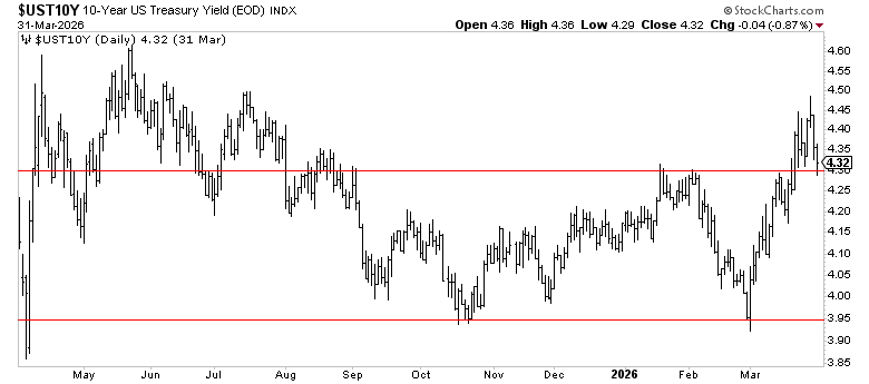 The 10-year. As long as yields stay below this key 4.3% range, the rate environment is manageable. Rising rates would put additional pressure on equity valuations.