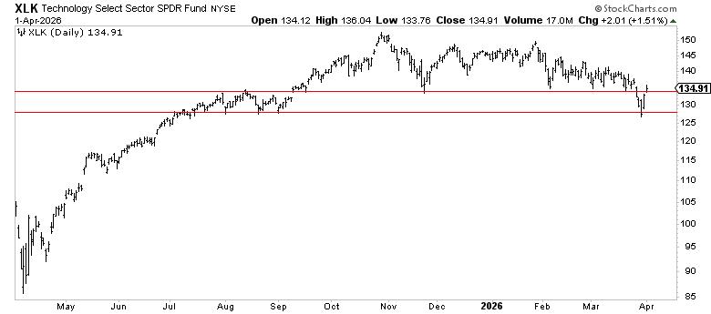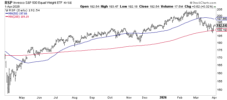 More importantly, RSP found support right at its 200-day moving average (189.19) during the March selloff and bounced. It’s now trading at 192.54, back above that level. When the average stock in the index is holding its long-term trend while the cap-weighted index breaks below it, the problem is at the top of the market cap spectrum, not the foundation.