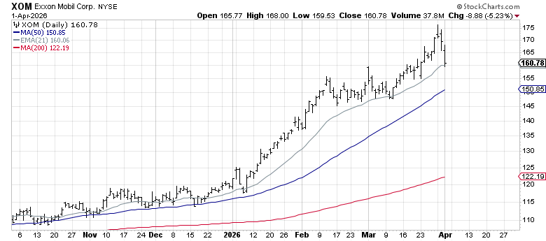 XOM is trading 31% above its 200-day moving average, firmly in an uptrend, and riding the oil move. March was +10% while the S&P fell 5.1%. In a market struggling for direction, XOM has been a relative strength standout.