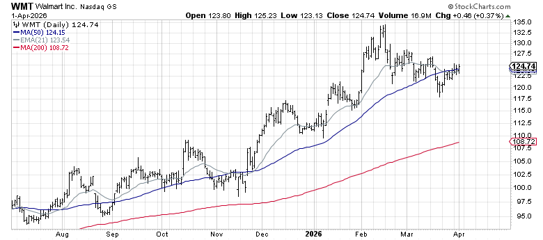 Another defensive compounder with current negative correlation to the index. WMT is above its 200-day and has held steady through the March volatility.