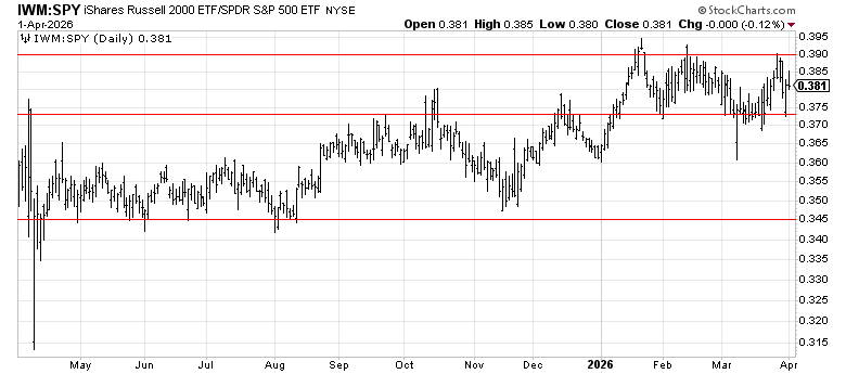 What’s worth noting: despite the March selloff, IWM is actually still positive on the year at +1.6%. Small caps have quietly held up better than the large-cap index on a YTD basis, even though they’re 7.3% off their January highs. The IWM:SPY ratio tells the relative story. It’s currently at 0.381 near the top of the 2025 range (0.345 - 0.382).