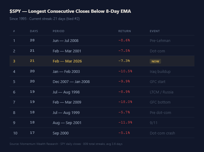This is a level we track closely. The 200-day SMA is the most widely followed trend indicator in equity markets. A monthly close below it doesn’t happen often, and when it does, it tends to mark either the start of something worse or a washout that resolves higher.
