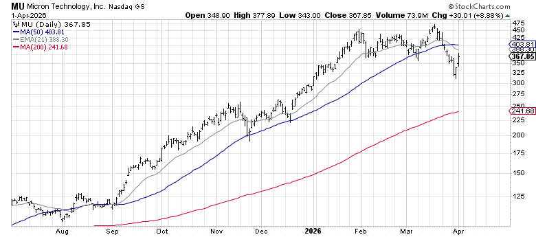Micron sits at the center of the memory trade as one of the most powerful themes in the market right now. The AI-driven shortage of high-bandwidth memory remains severe, with HBM sold out through year-end and pricing locked in. MU is trading 50% above its 200-day moving average. It pulled back quite a bit in March along with the broader tech complex, but the fundamental story hasn’t changed.