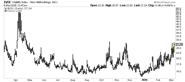 VIX: 23-28 range. Elevated, rising, but not panicked. A push toward 30 is possible if the 200-day SMA breaks.