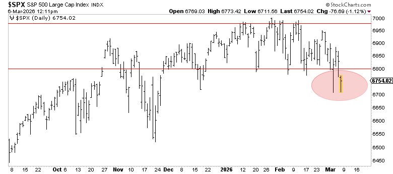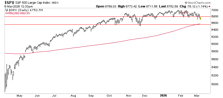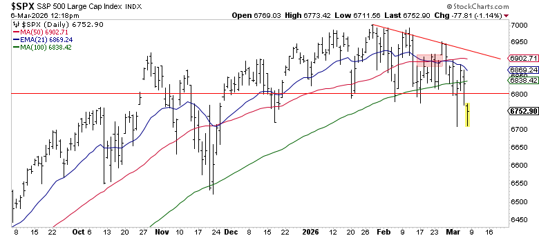 The S&P 500 has turned negative on the year. After five months of coiling between 6,800 and 7,000, the index decisively failed at 6,900 resistance and is now trading around 6,735 — below both its 50-day and 100-day moving averages for the first time since the April 2025 tariff shock. The all-time high of 7,002 (January 28) feels like a long time ago.