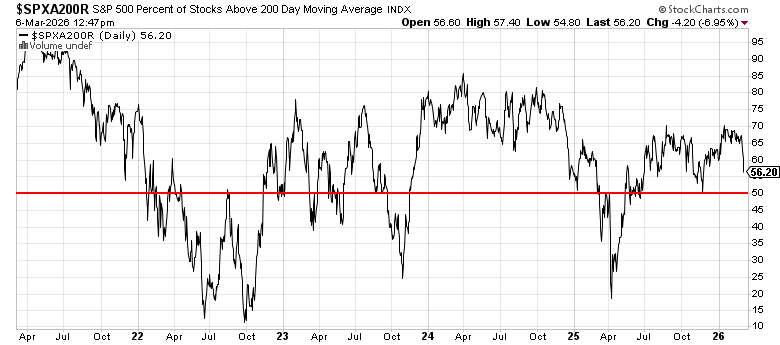 Breadth: Deteriorating. Only 56% of S&P 500 stocks above their 200-day MA. The advance/decline line is trending down even as the index stays relatively close to highs. Narrow leadership is a warning sign.