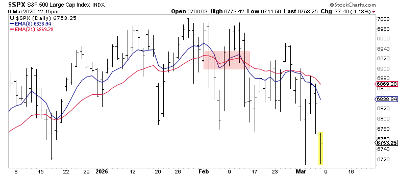 The intermediate picture is where things get interesting. The S&P 500 broke below its 50-day SMA (~6,863) on February 27 and hasn’t reclaimed it. It then broke below the 100-day (~6,835) on March 5. The 21-day EMA has rolled over and crossed below the 50-day SMA — confirming the intermediate trend has turned bearish.