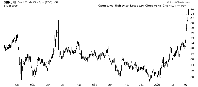 The Iran conflict — Joint US-Israeli strikes beginning February 28 effectively shut down the Strait of Hormuz. Brent crude broke above $90/bbl, up 26% in a week. The Strait handles ~20% of global oil supply. Insurance providers have pulled war-risk coverage for tanker transit — meaning commercial shipping can’t pass through even if it wanted to.