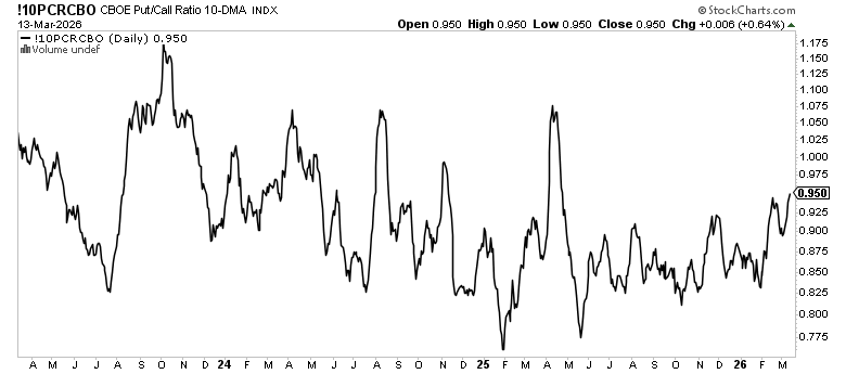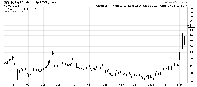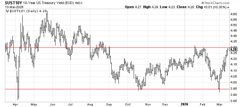 The 10-year yield settled at 4.28% on Friday — elevated, but notably stable given the backdrop. With oil above $98, inflation expectations grinding higher, and a war premium baked into energy, you’d expect rates to be running. They’re not. Since August 2025, the 10-year has been rangebound between 3.95% and 4.3%. As yields rise, we see that 4.3% upper resistance as the line in the sand — a sustained break above that level would signal the bond market is prioritizing inflation over recession risk, and that’s when equity multiples start to compress in a more meaningful way.