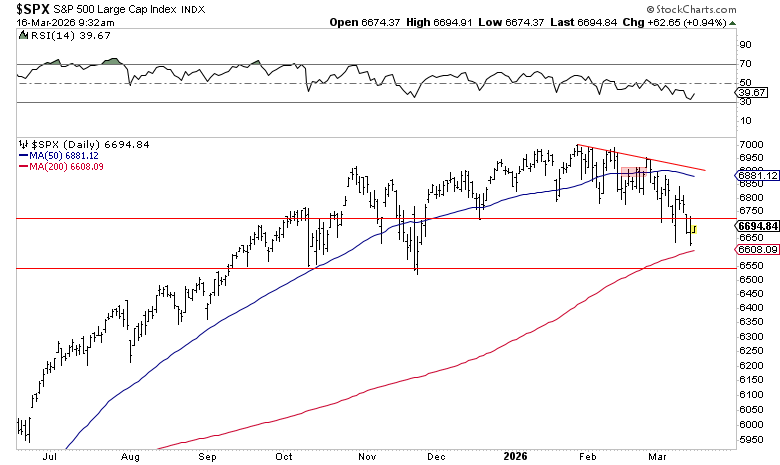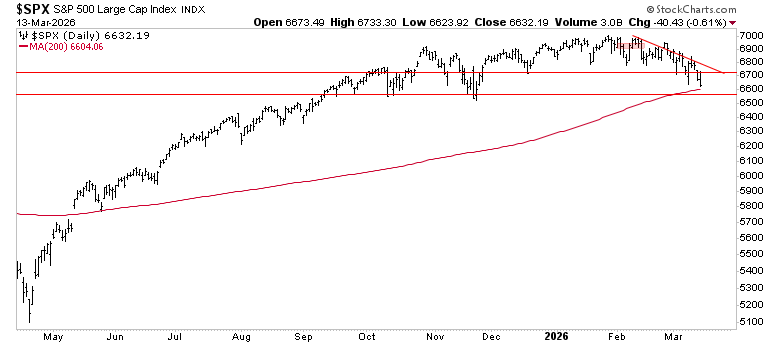 $SPX at 6632.19 — sandwiched between the 50-day moving average at 6881 (resistance) and the 200-day at 6608 (support). That gap is only 25 points and narrowing. The 200-day has held every test since this bull trend began. It’s now less than 1% below Friday’s close.