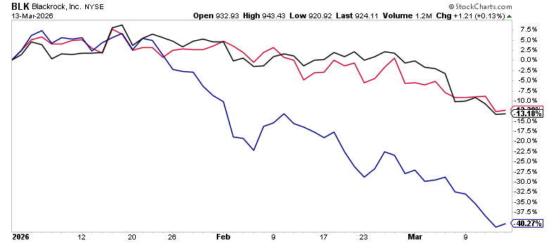 The private credit space continues to flash warning signs. Fund gating — where managers restrict investor redemptions — has spread beyond the initial wave, and the market is pricing it in. BlackRock (BLK) is down 13.18% YTD, but the real pain is in the pure-play alternatives: Blue Owl (OWL) has been cut nearly in half, down 40.27% YTD. That’s not a sector rotation — that’s the market repricing liquidity risk. The HYG/LQD ratio, which tracks appetite for credit risk, is essentially flat YTD, meaning investors aren’t panicking out of high yield broadly — they’re surgically punishing the corners of the market where redemption gates and mark-to-market opacity create uncertainty. This is worth watching closely: private credit stress that stays contained is a headwind; private credit stress that spills into broader high yield is a different animal entirely.
