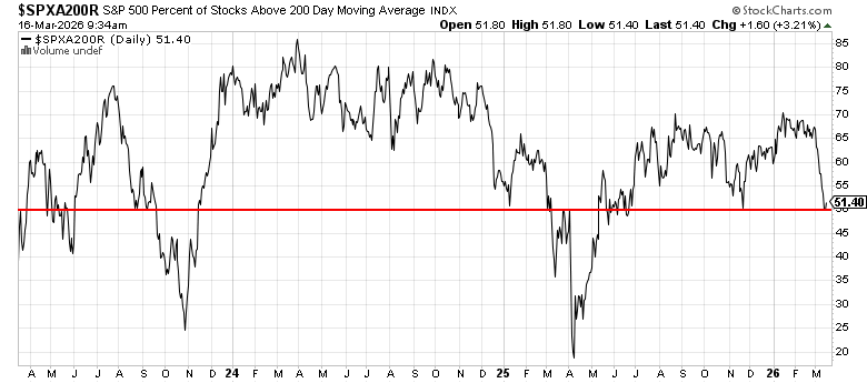 This chart strips away the index price and shows what the average stock is actually doing. Right now, roughly half the S&P 500 is trading below its own 200-day moving average.