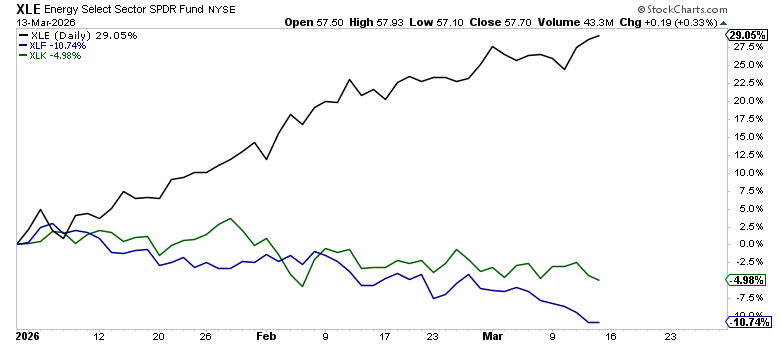 In a normal correction, correlations rise and everything sells together. In a regime change, you get divergence — and this divergence is extreme. $XLE is above both its 50-day and 200-day moving averages, broke to new highs in March, and was the only sector green this week (+2.45%). $XLK and $XLF are both below their 50-day and 200-day — confirmed intermediate-term downtrends.