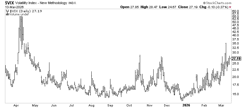 VIX at 27.19 — third consecutive week above 25. The SPX put/call ratio hit 1.16 on Wednesday. AAII bullish sentiment fell to 31.9%, below the 37.5% long-term average for the fourth straight week.